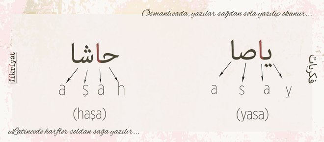 Burada elif harfinin kelime ortasında a sesini karşılaması "yasa" ve "haşa" kelimelerinin Osmanlı alfabesiyle yazımıyla gösterildi.