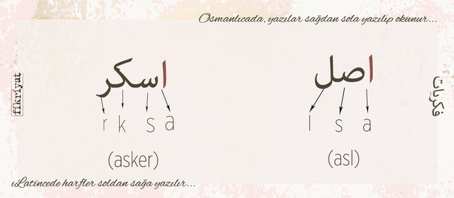 Burada elif harfinin kelime başında a sesini karşılaması "asl" ve "asker" kelimelerinin Osmanlı alfabesiyle yazımıyla gösterildi.
