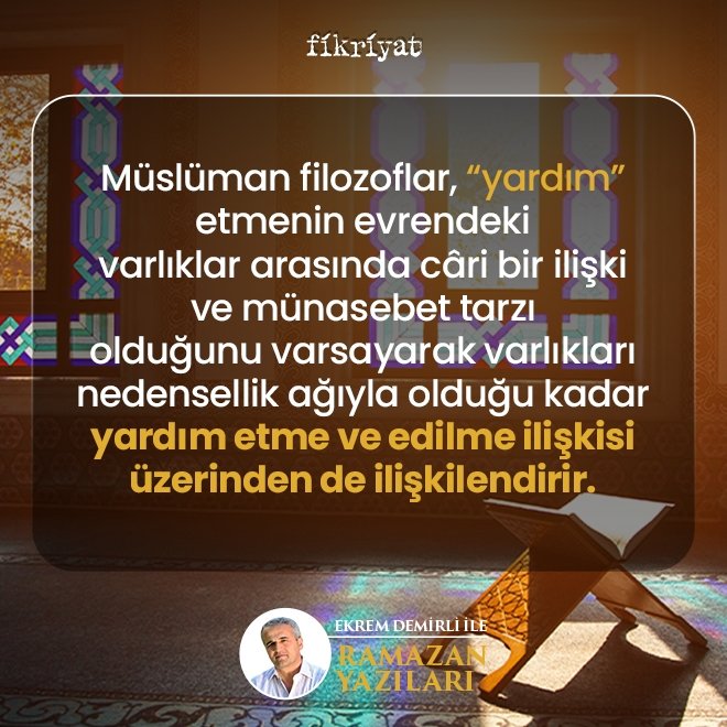 Müslüman filozoflar "yardım" etmenin evrendeki varlıklar arasında câri bir ilişki ve münasebet tarzı olduğunu varsayarak varlıkları nedensellik ağıyla olduğu kadar yardım etme ve edilme (ifade ve istifade) ilişkisi üzerinden de ilişkilendirir. Bütün doğa yardım etme ve edilme ilişkisiyle birbirine bağlı varlıklarla doludur. Hay b. Yakzân, ahlâka doğada kaynak ararken güçlü göksel varlıkların yeryüzündeki zayıf ve süfli varlıklara yardım etmesini iyiliğin temeli saymış, göksel varlıkları taklit yoluyla ahlâklı olunabileceğini düşünmüştü. Vakıa gökyüzü ile yeryüzü arasında öteden beri tahayyül edilmiş bu ilişki, kadim toplumlarda ahlâkın izah edildiği örneklerin başında gelir. Güçlü ve mükemmel olan daha aşağı mertebedekine yardım eder, ona ihsanda bulunur. Bu bakımdan ahlâk ve iyilik, yardımseverlik üzerine kuruludur. Bununla birlikte yardım etmenin ahlâk olabilmesi, daha doğrusu ibadet haline gelebilmesi doğadaki örneğinin -eğer varsa- ötesinde anlam taşımasına bağlıdır. Başka bir anlatımla dinde ahlâk, doğadaki davranışı taklit etmek, doğal varlıkların ilişkisine dayanarak izah edilemeyecek kadar özel bir mahiyet arz eder.