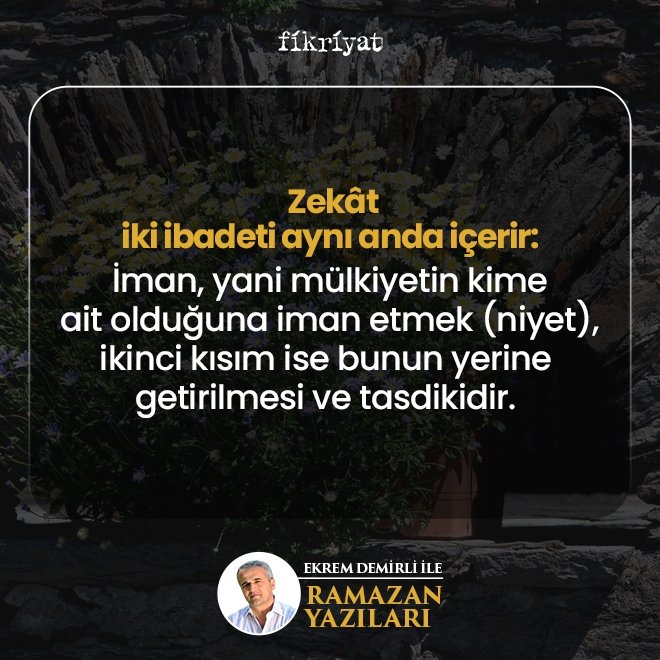 Zengin insan için "zekât" kayıtsız şartsız anlamda Hakk'a ait olan mülkiyetten insana düşen payın sadece sınırlı bir tasarruf olduğunu tasdiktir. Bir ibadette iman ile amelin aynı anda ortaya çıkmasının örneklerinden birisi zekât ibadetidir. İman zekâtta niyet kısmında ortaya çıkarken amel ise "ihraç" yani malın bir bölümünü belirlenen sınıflara ulaştırmakla tamamlanır. Bu durumda zekât iki ibadeti aynı anda içerir: İman, yani mülkiyetin kime ait olduğuna iman etmek (niyet), ikinci kısım ise bunun yerine getirilmesi ve tasdikidir. Haddizatında bütün ibadetlerde niyet, imanın temsili olarak bulunur. Bu itibarla niyet, ibadeti imana bağlayan veya imanın ibadete uzamasını sağlayan köprüdür. Amel ve ahlak diye bir ayrım ortaya koyacak olursak, niyet ahlak adını almaya daha yakın olur. Öyleyse zekât bu tasdik sayesinde temizlenme ameliyesi haline gelerek, insanı ve onun zihnini "kirlerden" arındırır. Hz. Peygamber "Müminin niyeti amelinden hayırlıdır" dediğine göre zihni esas temizleyenin niyet, daha doğrusu mülkiyetin kime olduğu hakkındaki iman olduğunu düşünmek mümkündür.