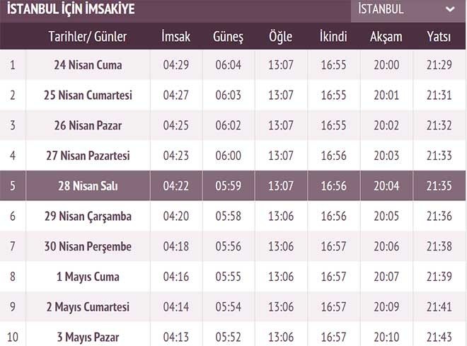 Diyanet İşleri Başkanlığı'nın yayınladığı imsakiye takvimine göre 23 Nisan Perşembe gecesini 24 Nisan'a bağlayan gece vatandaşlar oruç ibadetini yerine getirebilmek için sahura kalkacaklar. Müslüman alemi için önemli aylar arasında bulunan Ramazan ayında oruç ibadeti yerine getirilecek. İstanbul'da yaşayanlar ilk sahur ve iftar saatleri araştırmaya başladı. Diyanet İşleri Başkanlığı'nın internet sitesinde yayınlanan imsakiyede orucun saat kaçta açılacağı belli oldu.Peki İstanbul'da ilk iftar vakti ne zaman? İşte İstanbul sahur ve iftar saati ile ilgili detaylar...