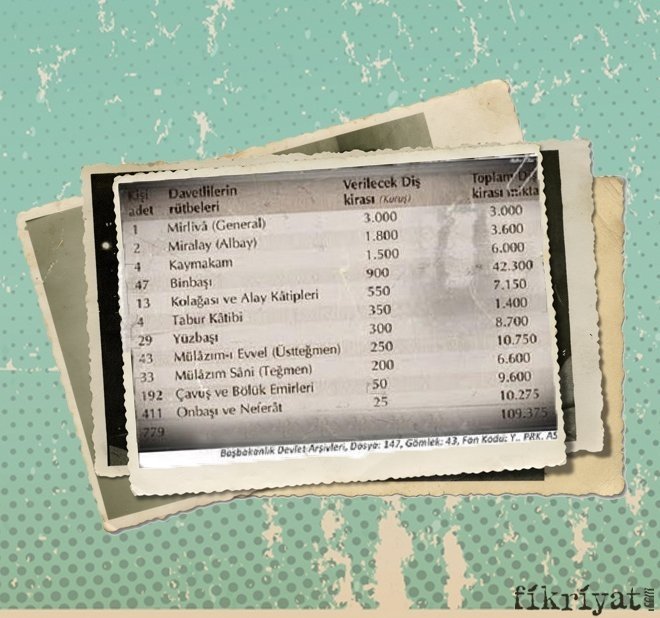 Başbakanlık Devlet Arşivleri, Dosya: 147, Gömlek: 43 kaynaklı belgeye göre: General 3.000, albay 3.600, kaymakam 6.000, binbaşı 42.300, kolağası ve alay katipleri 7.150, tabur katibi 1.400, yüzbaşı 8.700, üsteğmen 10.750, teğmen 6.600, çavuş ve bölük emirleri 9.600, on başı ve neferat 10.275 kuruş ile toplam verilecek diş kirası 109.375'i bulmuştu.