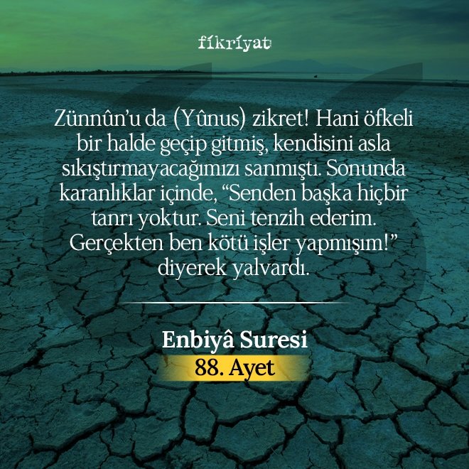 Zünnûn'u da (Yûnus) zikret! Hani öfkeli bir halde geçip gitmiş, kendisini asla sıkıştırmayacağımızı sanmıştı. Sonunda karanlıklar içinde, "Senden başka hiçbir tanrı yoktur. Seni tenzih ederim. Gerçekten ben kötü işler yapmışım!" diyerek yalvardı.