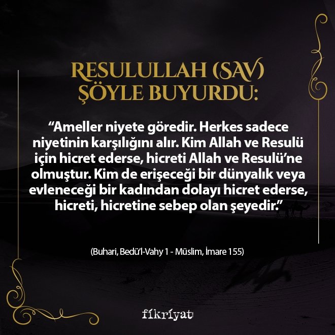 "Ameller niyete göredir. Herkes sadece niyetinin karşılığını alır. Kim Allah ve Resulü için hicret ederse, hicreti Allah ve Resulü'ne olmuştur. Kim de erişeceği bir dünyalık veya evleneceği bir kadından dolayı hicret ederse, hicreti, hicretine sebep olan şeyedir."