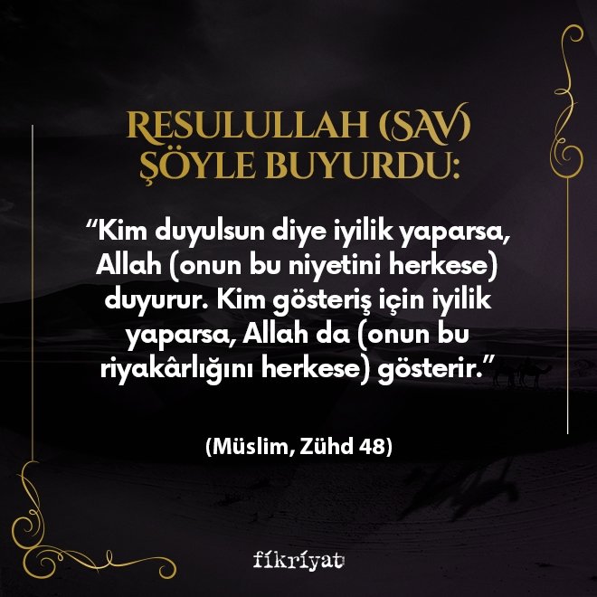 "Kim duyulsun diye iyilik yaparsa, Allah (onun bu niyetini herkese) duyurur. Kim gösteriş için iyilik yaparsa, Allah da (onun bu riyakârlığını herkese) gösterir."