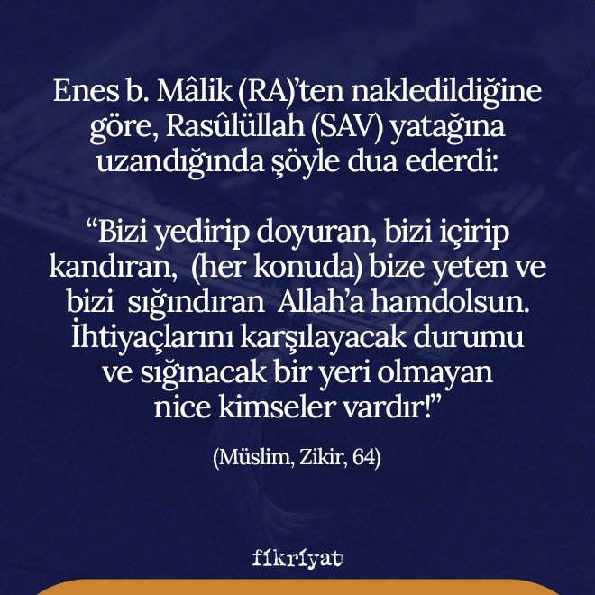 Enes b. Mâlik (r.a.)'ten nakledildiğine göre, Rasûlüllah (SAV) yatağına uzandığında şöyle dua ederdi: