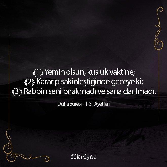 ﴾1﴿ Yemin olsun, kuşluk vaktine; ﴾2﴿ Kararıp sakinleştiğinde geceye ki; ﴾3﴿ Rabbin seni bırakmadı ve sana darılmadı.