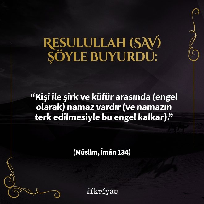 "Kişi ile şirk ve küfür arasında (engel olarak) namaz vardır (ve namazın terk edilmesiyle bu engel kalkar)."
