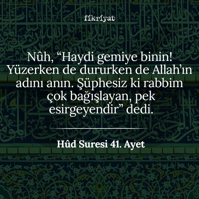 Nûh, "Haydi gemiye binin! Yüzerken de dururken de Allah'ın adını anın. Şüphesiz ki rabbim çok bağışlayan, pek esirgeyendir" dedi.