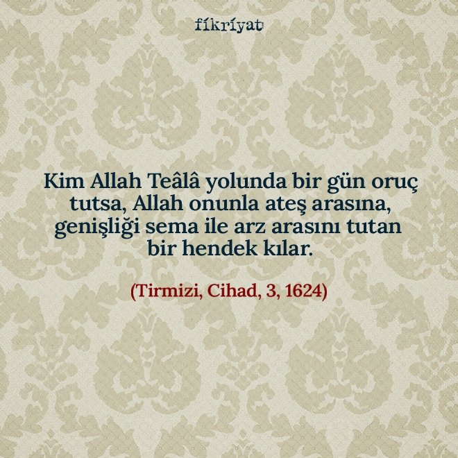 "Kim Allah Teâlâ yolunda bir gün oruç tutsa, Allah onunla ateş arasına, genişliği sema ile arz arasını tutan bir hendek kılar."