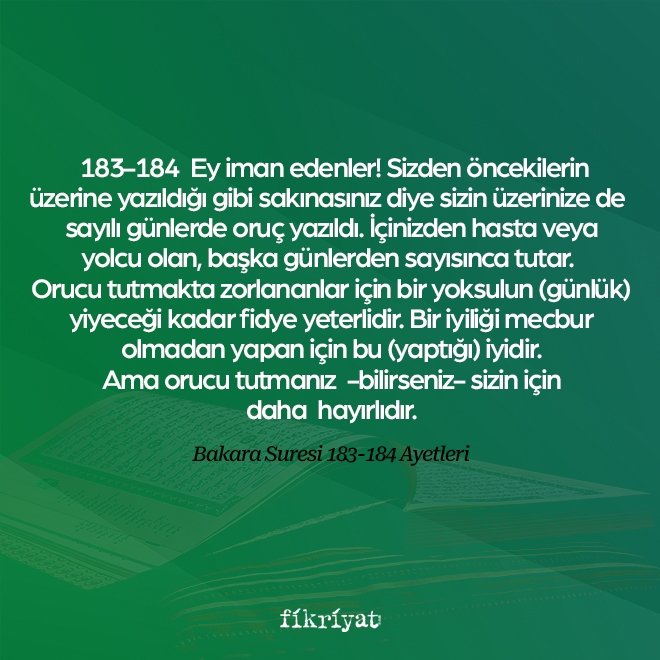 ﴾183-184﴿ Ey iman edenler! Sizden öncekilerin üzerine yazıldığı gibi sakınasınız diye sizin üzerinize de sayılı günlerde oruç yazıldı. İçinizden hasta veya yolcu olan, başka günlerden sayısınca tutar. Orucu tutmakta zorlananlar için bir yoksulun (günlük) yiyeceği kadar fidye yeterlidir. Bir iyiliği mecbur olmadan yapan için bu (yaptığı) iyidir. Ama orucu tutmanız -bilirseniz- sizin için daha hayırlıdır.