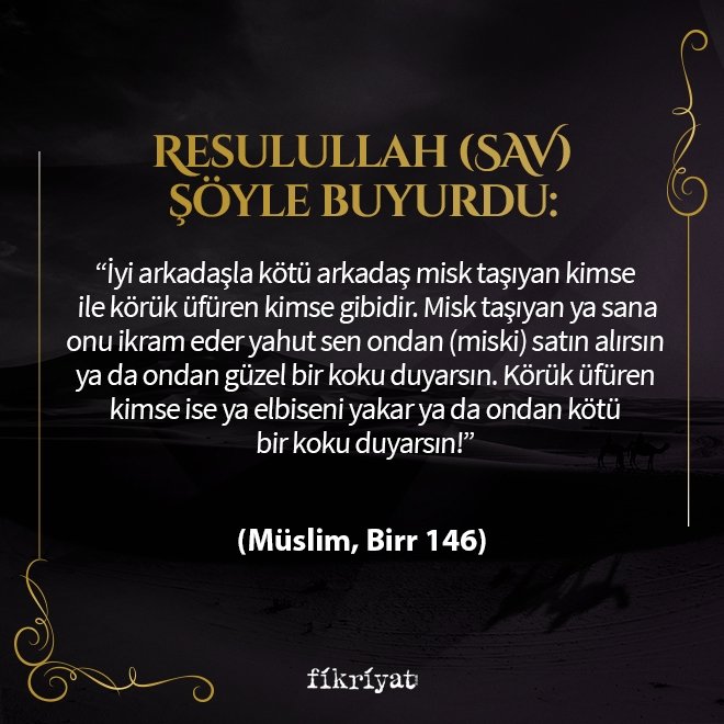 "İyi arkadaşla kötü arkadaş misk taşıyan kimse ile körük üfüren kimse gibidir. Misk taşıyan ya sana onu ikram eder yahut sen ondan (miski) satın alırsın ya da ondan güzel bir koku duyarsın. Körük üfüren kimse ise ya elbiseni yakar ya da ondan kötü bir koku duyarsın!"