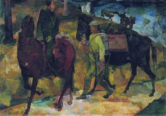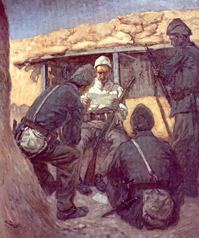 Savaşta askerlerin psikolojisi, ölüm korkusu, özlem gibi insani duygular ya da savaş dinamizmi içinde yaşananlar tablolarında iri fırça darbeleri ile daha da belirginleşir. Resimde bir asker mektup okumakta, diğerleri dinlemekte, belki de diğerleri okuma yazma bilmemekte. Yerde duran okunmuş belki de okunmayı bekleyen mektup dikkat çekici. Mimari mekanın yığma taş çatısının, güneşin aydınlığının ve gölgenin verilişinin, silah ve askeri malzemelerinin ve figürlerin duruşlarının son derece gerçekçi işlenişi sayesinde ortamın duygusal atmosferi başarıyla yansıtılmıştır.