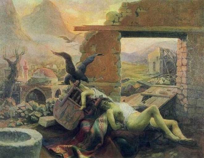 Hüseyin Avni Lifij'in Karagün adlı tablosu, alegorik bir yorumla tarihi bir konuyu ele alınır. Kompozisyonda Kurtuluş Savaşı sırasında düşmanın yakıp yıktığı bir köy kalıntısı içinde, ön planda giysileri parçalanmış ve tecavüz edilmiş izlenimi veren yarı çıplak ve öldürülmüş bir kadın bedeni, kilim üzerinde resmedilmiştir. Kadın figürünün başucunda, Anadolu'nun yerel sanat anlayışıyla üretilmiş ve işlenmiş bir beşik üzerinde, anneye doğru sırt aşağı uzanmış ölü çocuk figürü yer almıştır. Çocuğun ölü bedeninin üzerinde bulunduğu beşiğin ayağına, sivri ve keskin gagalı, kanatlarını heybetle iki yana doğru açmış, kuyruğu beşik üzerinden arkaya doğru uzanan bir kartal yerleştirilmiştir.