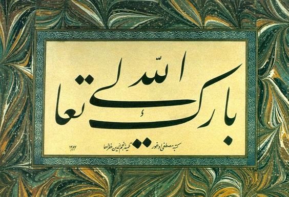 Cumhurbaşkanlığı Külliyesi'nin makam odasında bulunan üç hat sanatı tablosundan sol baştaki Yesarizade Mustafa İzzet'e ait. Osmanlı hattatı ve celî ta'lik üstadı olan sanatkarın bu tablosunda; "Bârekallahu Teâlâ" - "Allâhu Teâlâ bereketli kılsın" yazmakta.