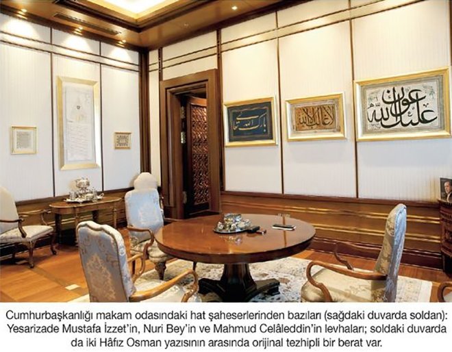 Cumhurbaşkanlığı makam odasındaki hat şaheserleri külliyenin duvarını süslüyor; Yesarizade Mustafa İzzet, Nuri Bey, ve Mahmud Celaleddin'in hat sanatıyla icra ettikleri eserler yer alıyor.