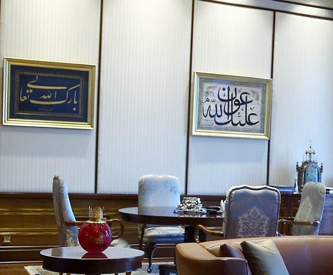 Cumhurbaşkanlığı Külliyesi'nde Recep Tayyip Erdoğan'a tahsis edilen makam odasının duvarında da bulunan tablo, Beşiktaşlı Hacı Nuri Efendi'ye ait: "Lâ Galibe İllâllah" yazısıdır. Anlamı: "Allah'tan başka galip yoktur!" olan ibârenin hikayesi ilginç: Endülüs halifelerinden biri Hristiyanlar'a karşı girdiği savaştan galip gelir ve Kurtuba'daki sarayına dönerken tezahürat yapan halktan gelen "El Galib!", yani "Muzaffer!" nidâlarına, "Allah'tan başka galip yoktur!" mânâsına gelen "Lâ Galibe İllâllah" cevabını verir ve bu sözü sonra Kurtuba Sarayı'nın girişindeki mermere nakşettirir.