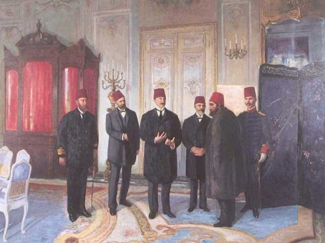 Sultan Abdülmecid, Abdülhamid'in hâl' edilişini böyle resmetmiş, tablonun adını "Osmanlı'ya veda" olarak isimlendirmişti.