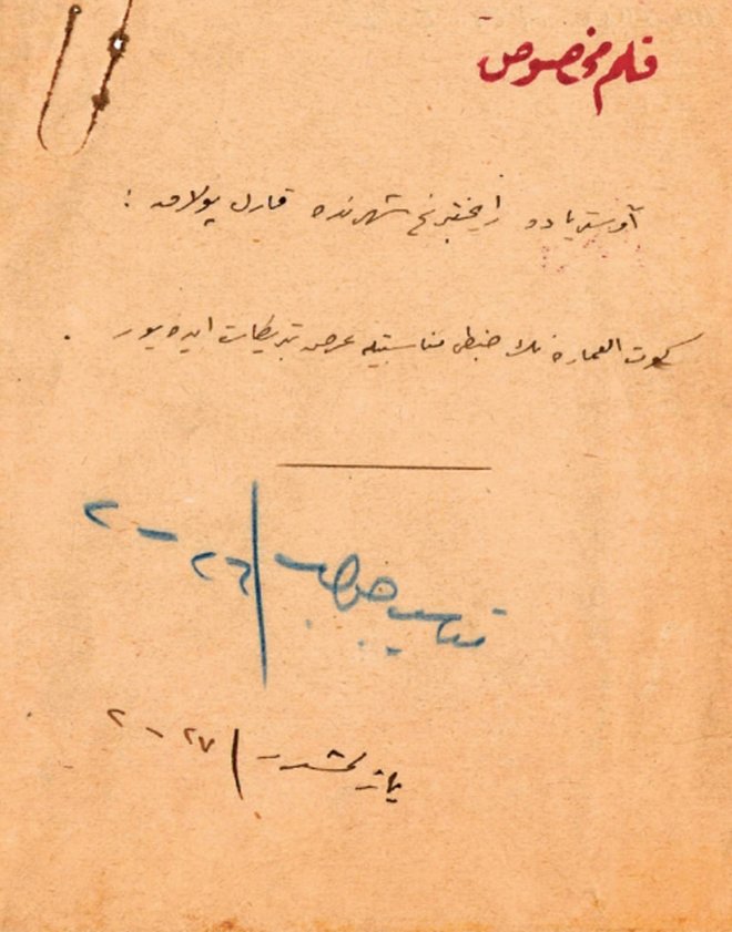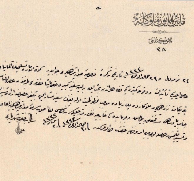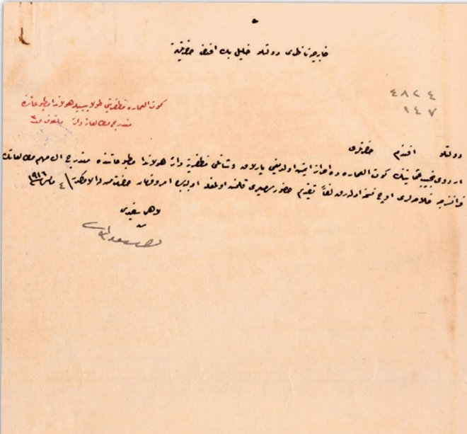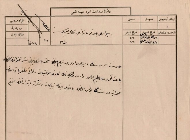 Fotoğrafta, Almanya İmparatoru'nun Kûtü'l-Amâre zaferinden dolayı okulları bir gün tatil etmesi ve Osmanlı'nın Berlin Sefâreti vasıtasıyla padişaha gönderdiği tebrik mesajından dolayı duyulan memnuniyetin bildirilmesini içeren belge görülüyor.