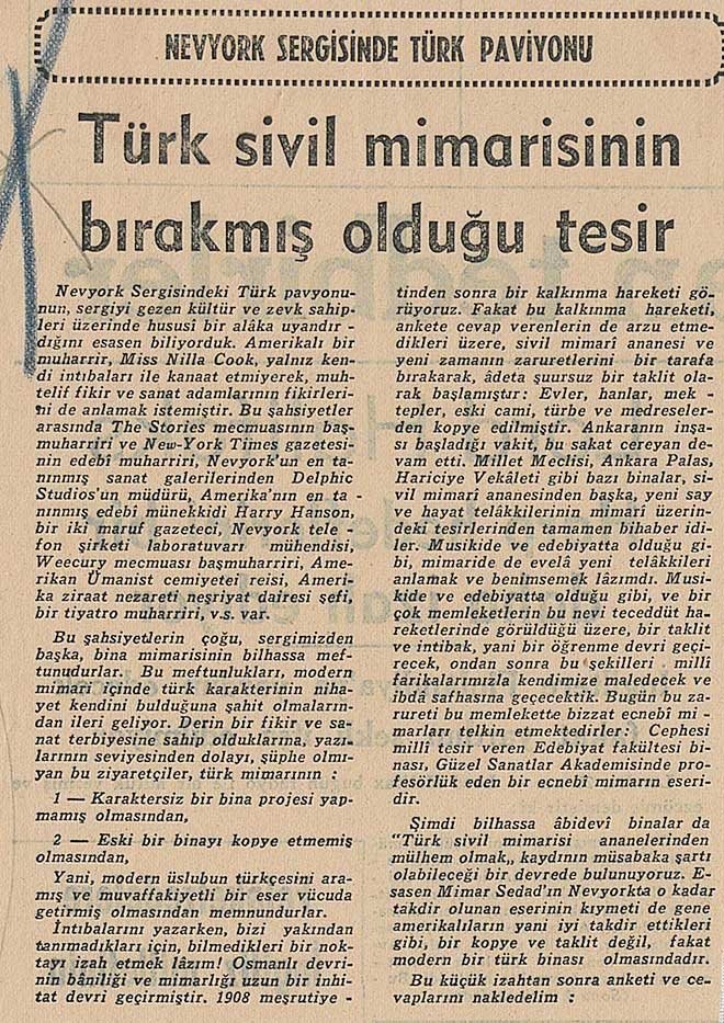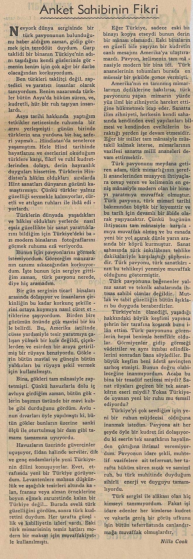 Fuarda Türk pavyonu oldukça dikkat çekmişti. Dönemin ünlü Amerikan yazarı Nilla Cook, fuardaki Türk pavyonu ile ilgili yazısında, yapının mimarisi hakkında adeta büyülenerek şunları kaleme almıştı: