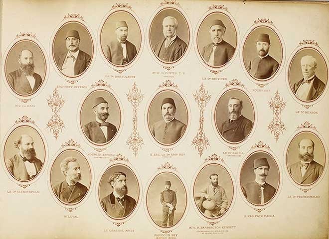 Bu kurucu üyelerin arasında, Dr. Abdullah Bey, Marko Paşa, Mekteb-i Tıbbiye-i Mülkiye-i Şahane Müdürü Kırımlı Aziz bey ve Serdar-ı Ekrem Ömer Paşanın yanı sıra Ömer Rüstü paşa, Veli Paşa, Serdar-ı Ekrem Ethem Paşa, Mr. Ch. Curtis, Baron Prokeschosten, Dr. Servicyan Efendi, Dr. Peştemalcıyan Paşa, Avusturya Sefiri gibi önemli isimler yer alır.