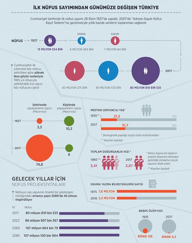 Cumhuriyet tarihinde ilk kez 1927'de gerçekleştirilen nüfus sayımından geçen yıla kadar nüfus 5 kat arttı. Bu dönemde kadın nüfusu 7 milyondan 40,3 milyona, erkek nüfusu da 6,6 milyondan 40,5 milyona yükseldi. Projeksiyonlara göre, nüfusun 2069 yılına kadar 107 milyon 664 bin 79'a ulaşması bekleniyor.