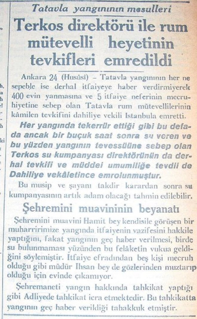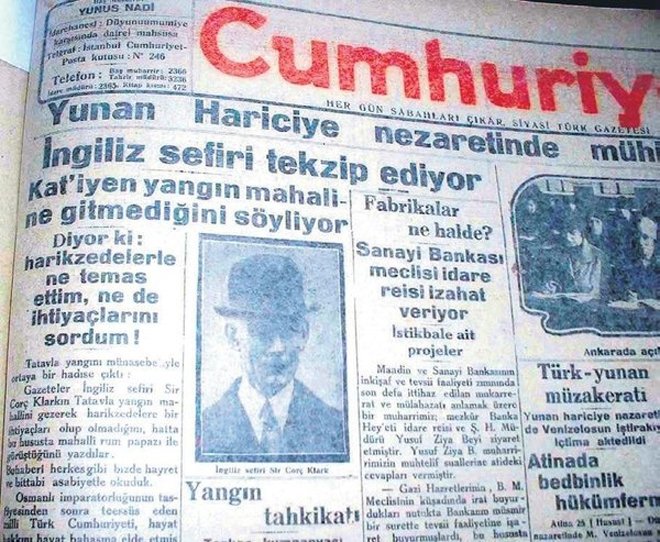 21 Ocak 1929’da kaçak rakı üretenler yüzünden Tatavla’da, yani Kurtuluş’ta büyük bir yangın çıkmış ve yüzlerce evi yakmıştı. 93 yıl önceki yangında İngiliz elçinin Kurtuluş’u ziyaret ettiği iddiası basında tartışma yaratmış, “Elçi Türkiye’deki çeşitli unsurlar arasında nifak çıkarmak için mi uğraşmaktadır” diye tartışılmıştı.