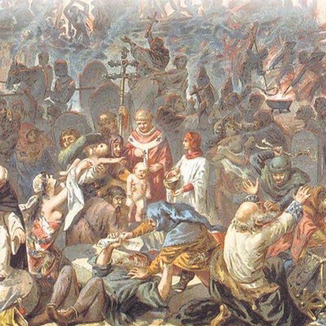 O dönemde Yahudiler, vebanın suçlusu olarak gösterilmiş, yok edilirlerse vebanın da biteceğine inanılmıştı. Yahudilerin kuyuları zehirleyerek hastalığa sebep oldukları dedikoduları yayıldı. İşkenceyle itirafa zorlandılar. 1348 yılı baharında Fransa Toulon'da ilk Yahudi katliamları başladı. Yahudiler ahşap evlere doldurularak yakıldılar. Daha sonra katliamlar İspanya, Belçika, İsviçre ve Almanya'ya yayıldı.