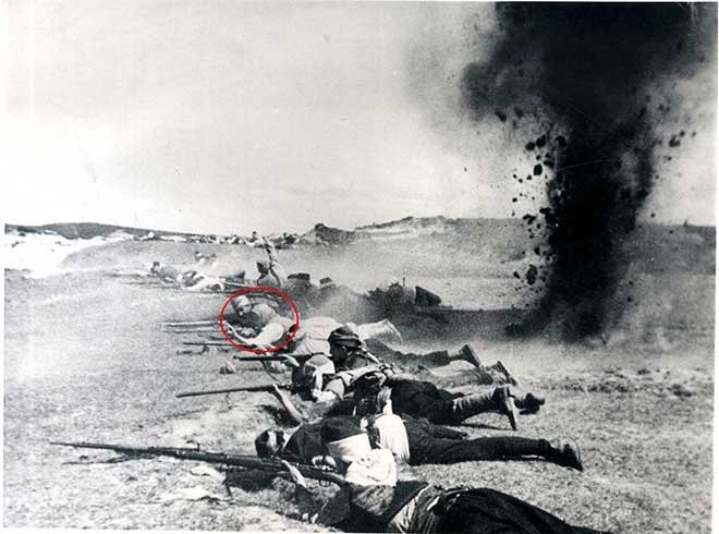 Fotoğraflarda, savaş sırasında cephede elinde silahla erkeklerin arasında siper almış bir kadının tam arkasında patlayan top mermisinin yaşattığı gerilimi yansıtan anın ve yanı başında şehit düşen askere rağmen gözünü namludan ayırmayan Türk kadınının azminin görüntüleri dikkati çekti.