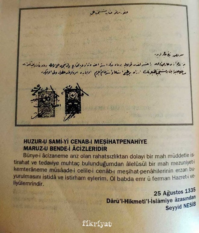 (x)Resim altı: Bünye-i acizaneme arız olan rahatsızlıktan dolayı bir mah müddetle istirahat ve tedaviye muhtaç bulunduğumdan alelusul bir mah mezuniyet-i kemteraneme müsaade-i celile-i cenab-ı meşihat-penahilerinin erzan buyurulmasını istida be istirham eylerim. Ol babda emr ü ferman Hazret-i veliyülemrindir.