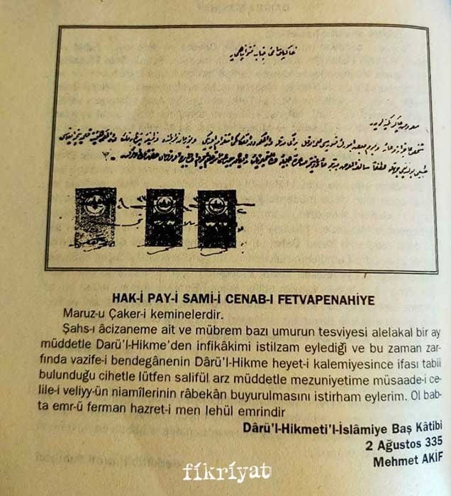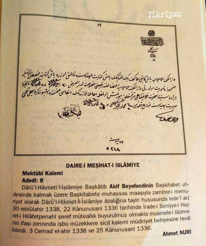 (x)Resim altı: Darü'l-Hikmeti'l-İslamiye Başkatib Akif Beyefendinin Başkitabet uhdesinde kalmak üzere Başkitabete muhassas maaşıyla zamime-i memuriyet olarak Darül-Hikmet-il-İslamiye azalığına tayin hususunda lede'l arz 30 rebiülahir 1338, 22 Kanunusani 1336 tarihinde İrade-i Seniyye-i Hazret-i Hilafetpenahi şeref müteallık buyurulmuş olmakla muamele-i lazimenin ifası zımmında işbu müzekkere sicil kalemi müdiriyet behiyesine tevdi kılındı. 3 Cemad el-ahir 1338 ve 25 Kanunusani 1336.