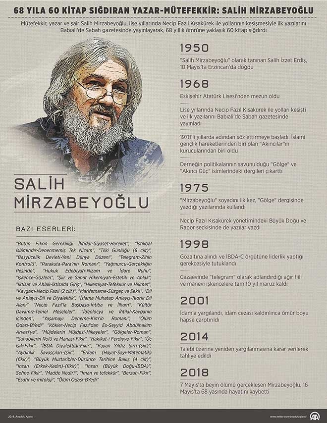 Mütefekkir, yazar ve şair Salih Mirzabeyoğlu, lise yıllarında Necip Fazıl Kısakürek ile yollarının kesişmesiyle ilk yazılarını Babıali'de Sabah gazetesinde yayınlayarak, 68 yıllık ömrüne yaklaşık 60 kitap sığdırdı. Kamuoyunda "Salih Mirzabeyoğlu" olarak tanınan ve 7 Mayıs'ta beyin ölümü gerçekleşen Salih İzzet Erdiş, 68 yaşında hayatını kaybetti.