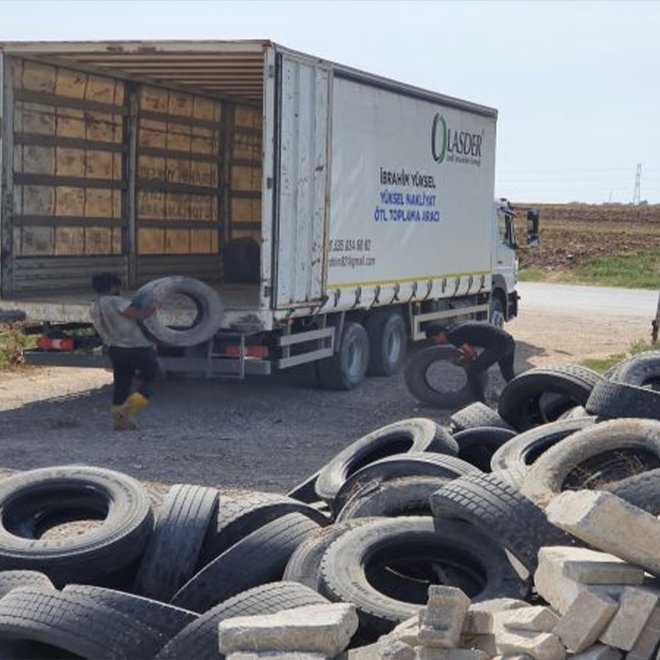 Edirne Belediyesi ve Lastik Sanayicileri Derneği arasındaki protokol kapsamında "Ömrünü Tamamlamış Lastiklerin Kontrolü Yönetmeliği" kapsamında sanayi siteleri, oto servisleri ve otomotiv lastikçileri tarafından biriktirilen ömrünü tamamlamış lastikler kamyonlara yüklenerek geri dönüşüm ve bertaraf işlemlerinin gerçekleşeceği tesislere götürülüyor.