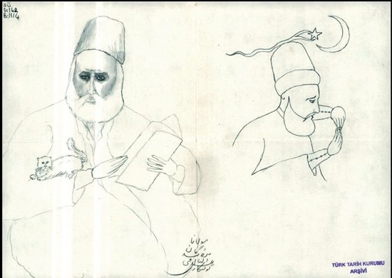 Bugün Türk Tarih Kurumu Arşivi Süheyl Ünver Koleksiyonu'nda bulunan Gölpınarlı'nın çizdiği resimler. Resmin altında "Gölpıñārlı ʿAbdülbāḳı̄ bende-yi bendegān-ı Mevlānā" yazmaktadır. Gölpınarlı bu resmi, geleceği müjdelenen Melamî kutublarından birini İsmail Saib Sencer'e benzettiği için çizmiştir. Kedi düşkünlüğü ile bilinen İsmail Efendi solda. Sağdaki ise Sıdkî'nin minyatüründen. Sizce benziyor mu?