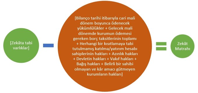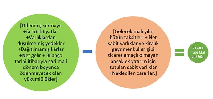 Net varlıkların hesaplanması yöntemi: Zekât matrahı = [Zekâta tabi varlıklar] – (eksi) [Bilanço tarihi itibarıyla cari mali dönem boyunca ödenecek yükümlülükler + Gelecek mali dönemde kurumun ödemesi gereken borç taksitlerinin toplamı + Herhangi bir kısıtlamaya tabi tutulmamış katılma/yatırım hesabı sahiplerinin hakları + Azınlık hakları + Devletin hakları + Vakıf hakları + Bağış hakları + Belirli bir sahibi olmayan ve kâr amacı gütmeyen kurumların hakları].