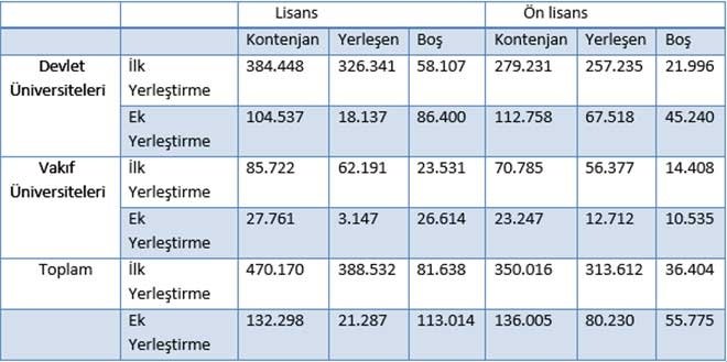 Bu tabloya göre devlet üniversitelerinin 384.448 lisans kontenjanın ek yerleştirmeler sonunda da 86.400'ü boş kalmıştır. Bu oldukça yüksek bir oran olup 5 yıllık süreç içerisinde lisans düzeyinde boş kontenjan sayısı sürekli artmaktadır.