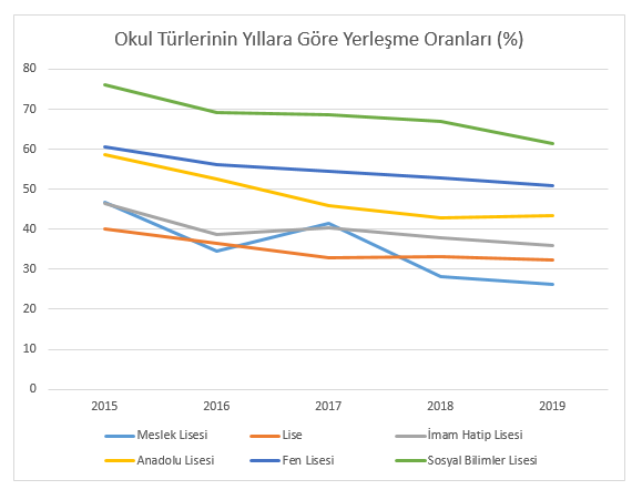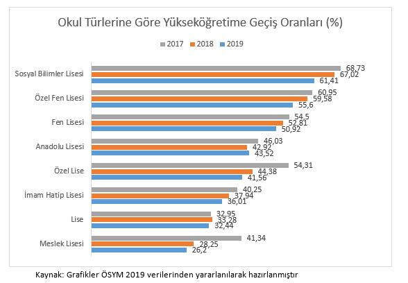 Üniversiteye yerleşme düzeyi olarak en düşük başarıya sahip olan okul türü, Mesleki ve Teknik Eğitim Lisesi mezunlarıdır. Bu okul türü mezunları, 2017 yılında %41,34, 2018 yılında %28,25 ve 2019 yılında ise %26,2 oranında üniversiteye yerleşebilmişlerdir.