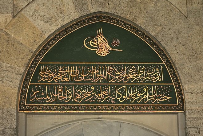 Resim 5: Kâmil Akdik'in Topkapı Sarayı Seferli Koğuşu'nun kapısına yazdığı celî sülüs kitâbe ve çektiği Sultan Reşad tuğrası.