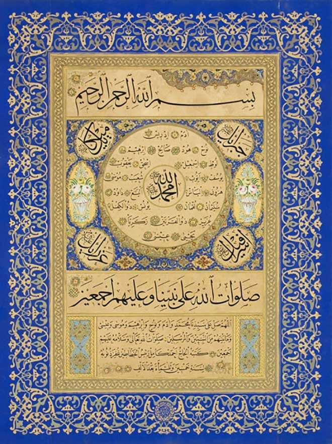 Resim 3: Kâmil Akdik'in hilye biçiminde yazdığı, meleklerin ve ismi mâlûm peygamberlerin yer aldığı sülüs-nesih bir levhası.
