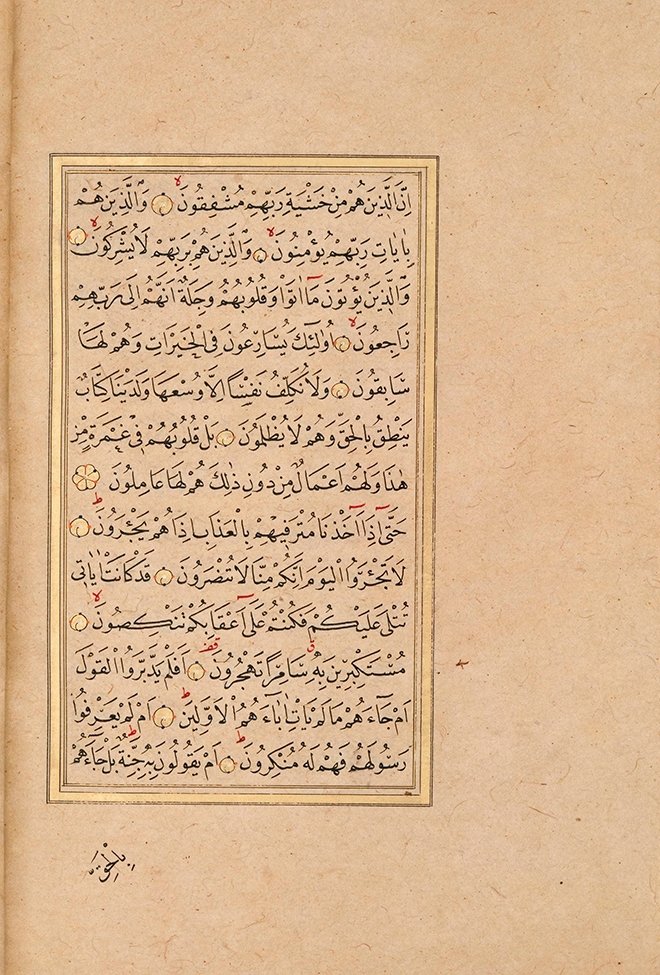 Resim 6: Mushafta "müşfikûn"la biten âyetin ilk satırda görüldüğü sahîfe (Mü'minûn, 23, âyet 57).