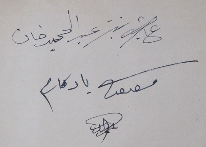Resim 4: 9 Mart 1960 günü ziyâretimizde, defterimdeki imzalarıyla: Ayşe binti Abdülhamîd Hân; Müşfika, yâdigârım; Necmeddin (Okyay).