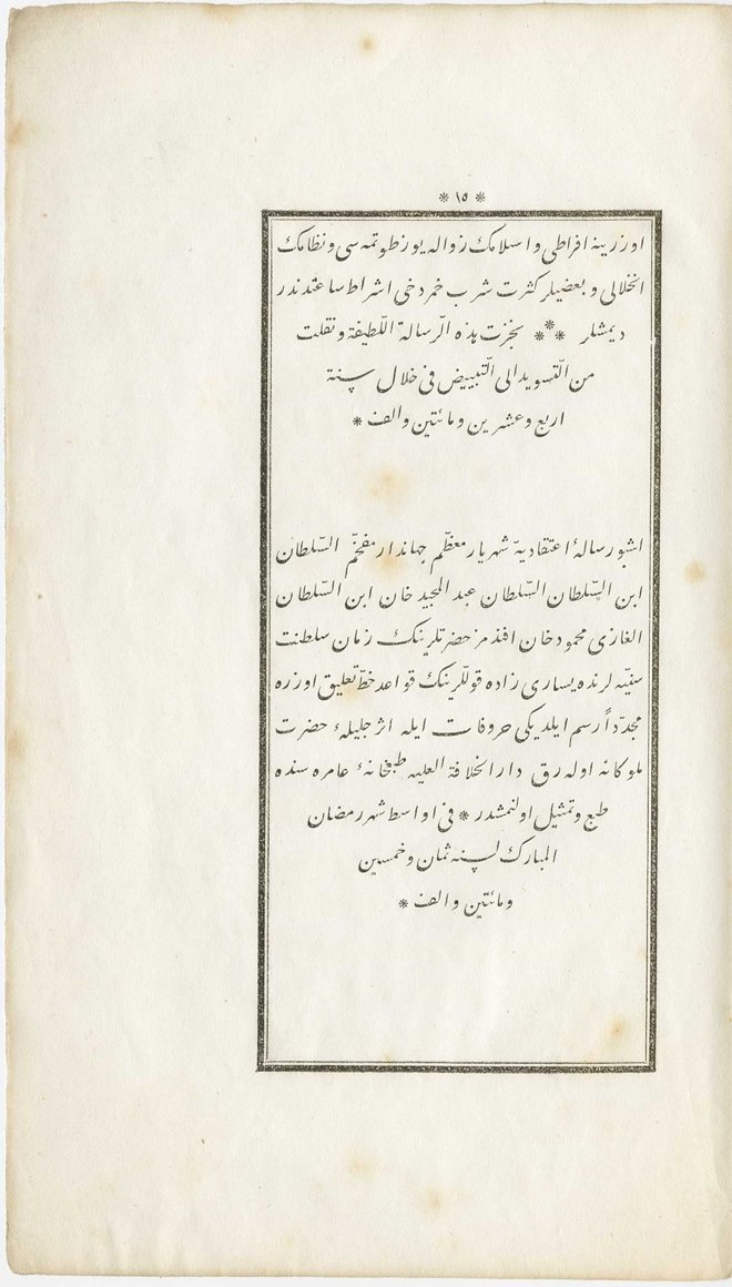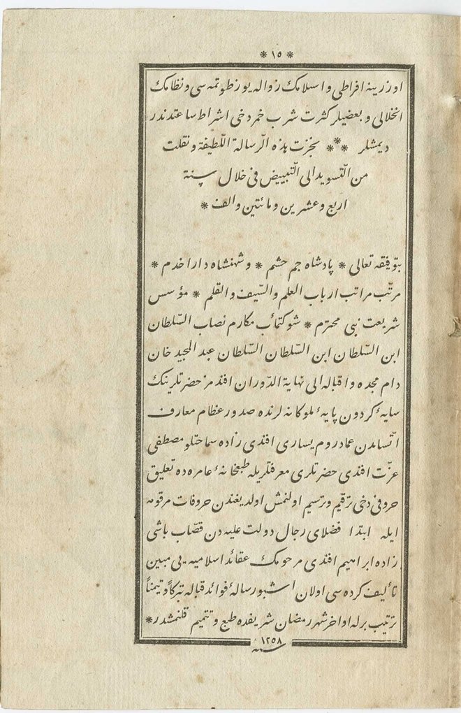 "Bitevfîkıhi Teâlâ * Pâdişâh-ı Cem haşem ve Şehinşâh-ı Dârâ-hadem * Mürettib-i merâtib-i erbâbi ilm'is-seyfi ve'l-kalem * Müessis-i şerîat-ı Nebiy-yi muhterem Şevketmeâb-ı mekârim-nisâb es-Sultân ibnü's-Sultâni ibnü's-Sultan es-Sultân Abdülmecîd Hân dâme mecdühû ve ikbâlühû ilâ nihâyeti'd-devrân Efendimiz Hazretlerinin saye-i gerdûn-pâye-i mülûkânelerinde sudûr-ı izâm-ı maarif-ittisâmdan İmâd-ı Rûm Yesârî Efendizâde semâhatlû Mustafa İzzet Efendi Hazretleri mârifetleriyle Tab'hâne-i Âmire'de ta'lîk hurûfu dahî terkîm ü tersîm olunmuş olduğundan hurûfât-ı merkûme ile ibtidâ fudalâ-yı ricâl-ı Devlet-i Aliyye'den Kasabbaşızâde İbrahim Efendi merhûmun akāid-i İslâmiyye'yi mübeyyin te'lîf-kerdesi olan işbu risâle-i fevâid-kıbâle teberrüken ve teyemmünen tertîb birle evâhir-i şehr-i Ramazân-ı şerîf'de tab' ü tetmîm kılınmışdır * Sene 1258" (Kasım 1842 başları).