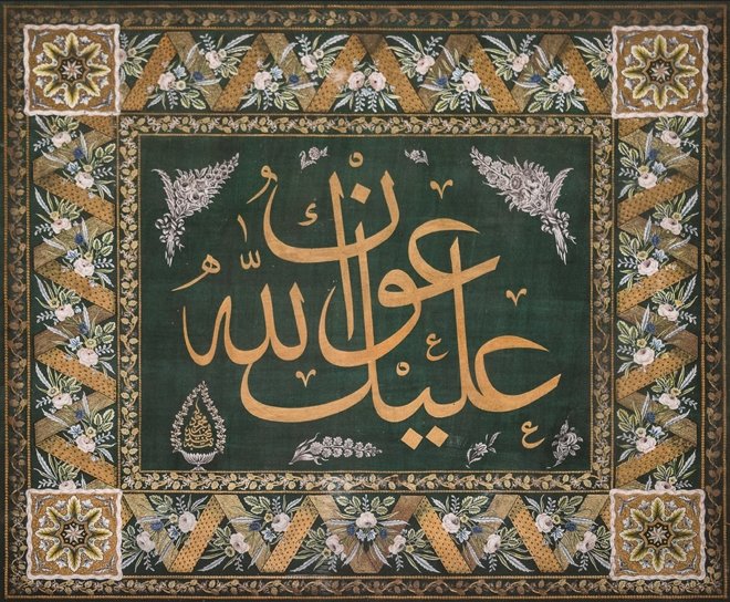 Resim 7: Sultan Abdülmecid'in celî sülüs zerendûd levhası. "Aleyke Avnullah".