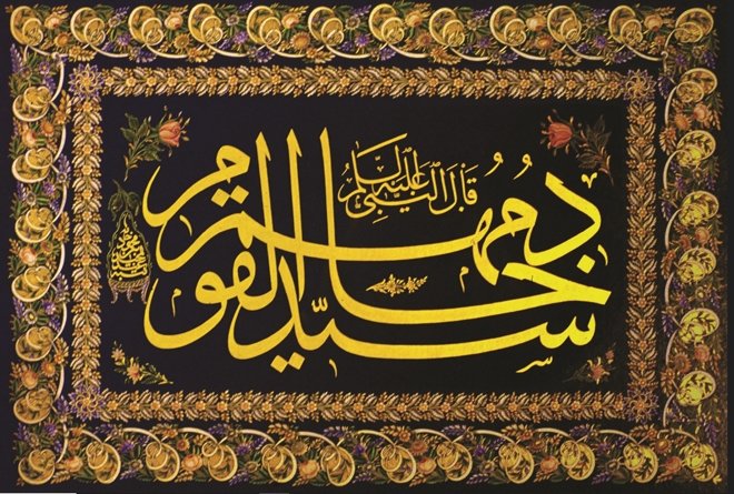 Resim 9: Sultan Abdülmecid'in celî sülüsle yazdığı zerendûd hadîs levhası. "Bir kavmin efendisi, ona hizmet edendir".