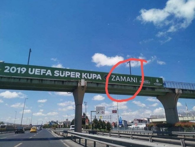 UEFA süper kupa maçı İstanbul'da oynanıyor. Bu akşam iki İngiliz takımından biri kupayı alacak. Bu yüzden süper maç öncesinde İstanbul'un çeşitli yerlerine bu maça dair bir bilgilendirme afişi asıldı. Tüm afişlerde İBB Başkanı Ekrem İmamoğlu'nun imzası var. Belediyenin afişleri.